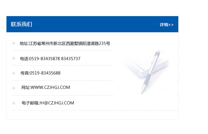 地址:常州市新北區友邦商務大廈1幢16、17層  電話:0519-85101652  傳真:0519-85112595  郵編:213022  網址:www.cz-jiayue_cn.weiyoub.com  郵箱:xiajifengaa@163.com